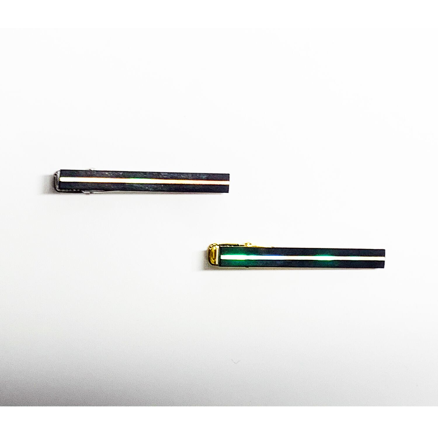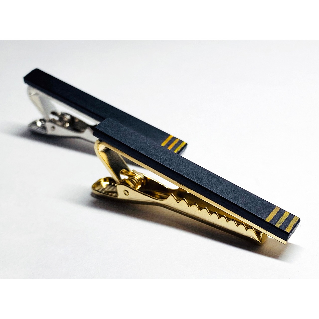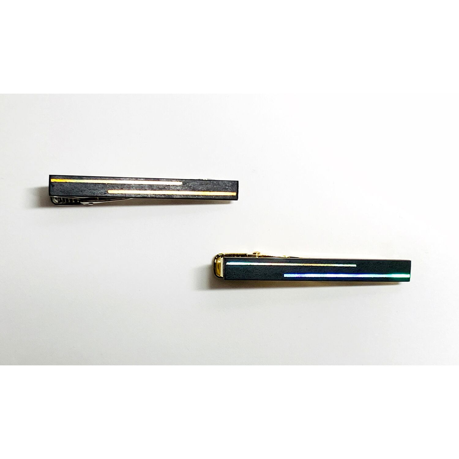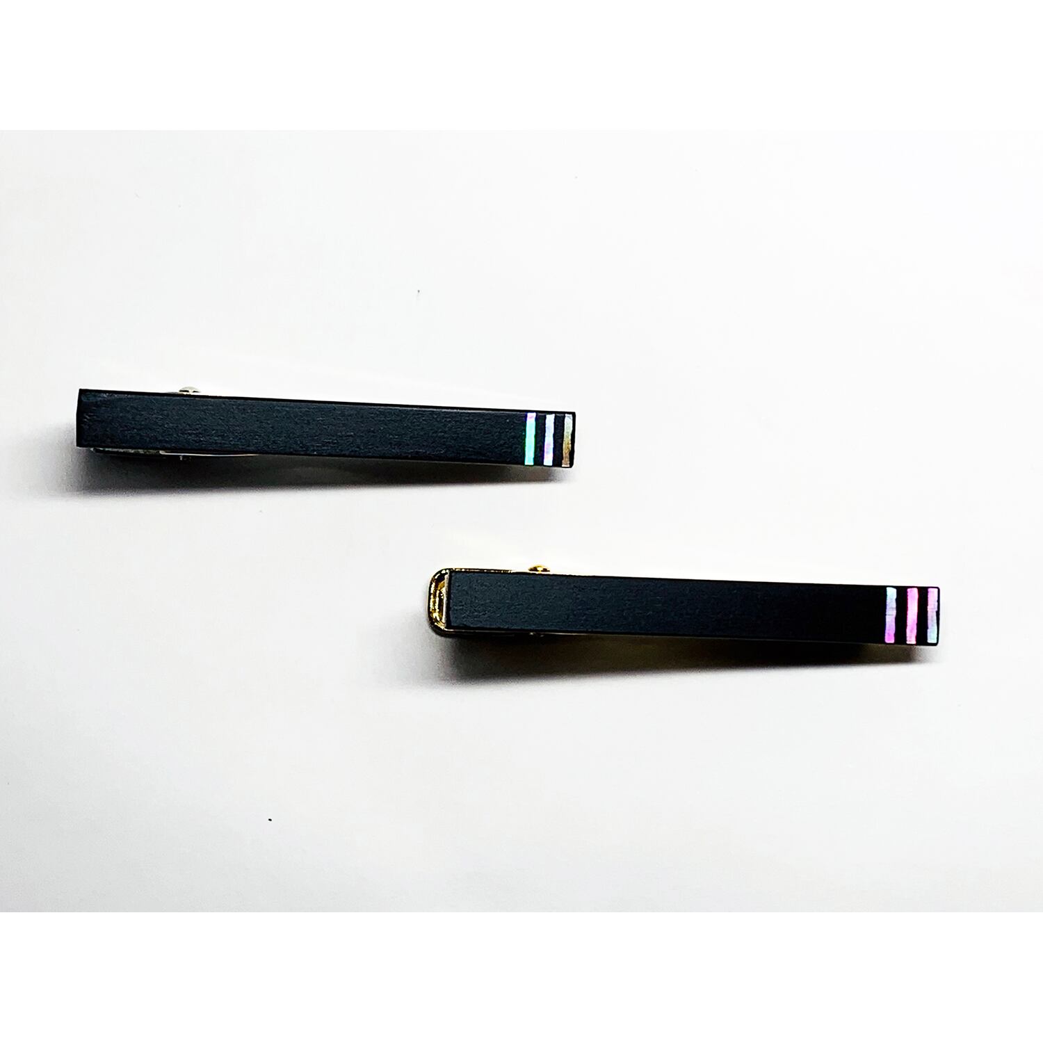 伏彩色をした夜光貝(裏に金箔)を漆で貼りつけ、錆漆*1で仕上げたシンプルで高級感のあるネクタイピンです。