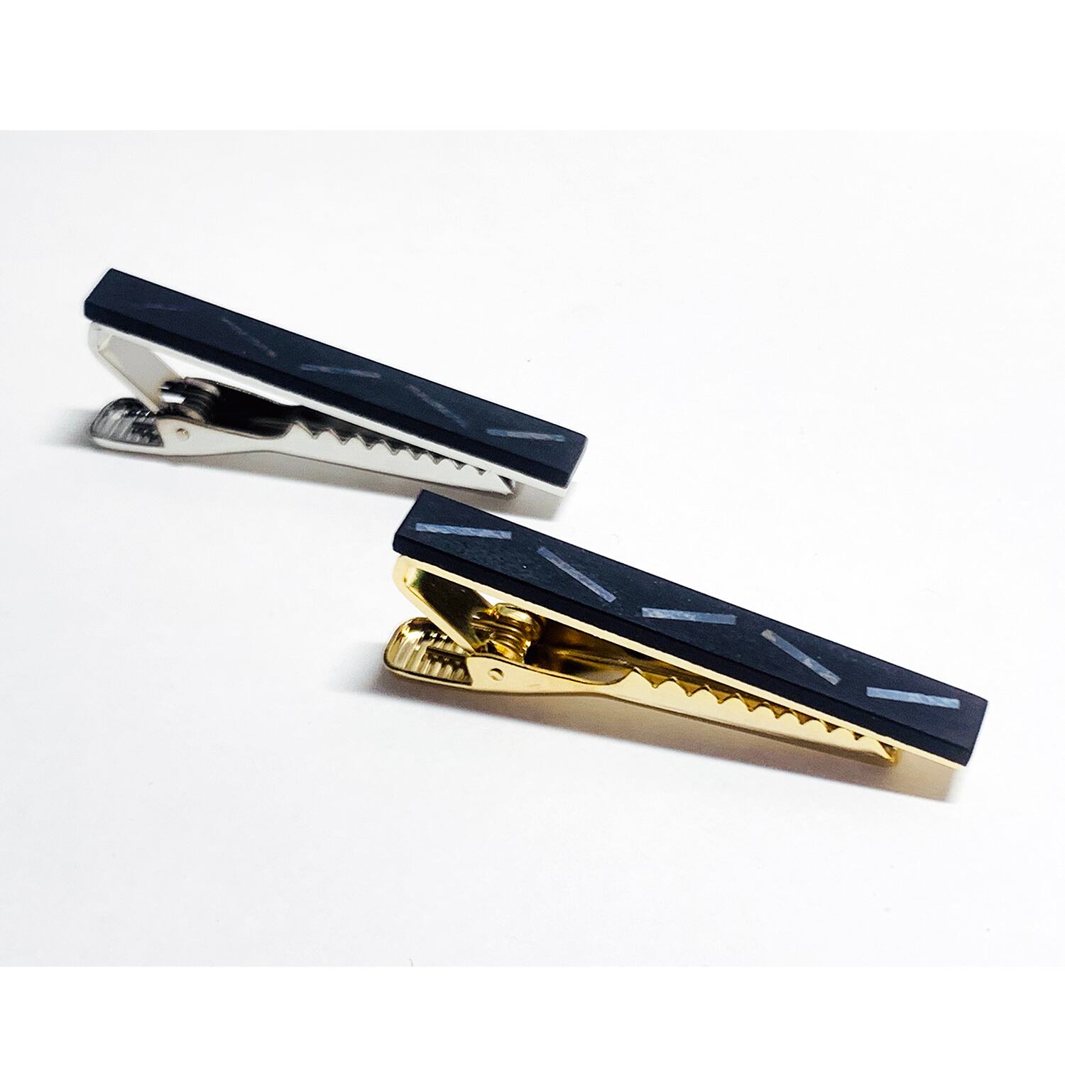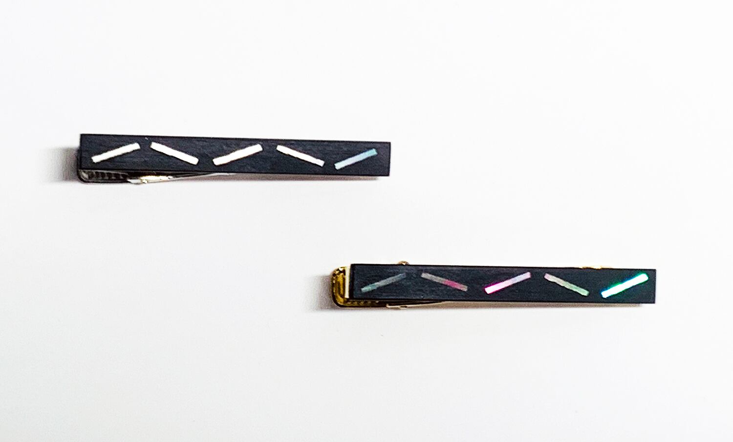 山や谷の情景をモチーフに夜光貝を漆で貼りつけ、錆漆*1で仕上げたシンプルで高級感のあるネクタイピンです。
