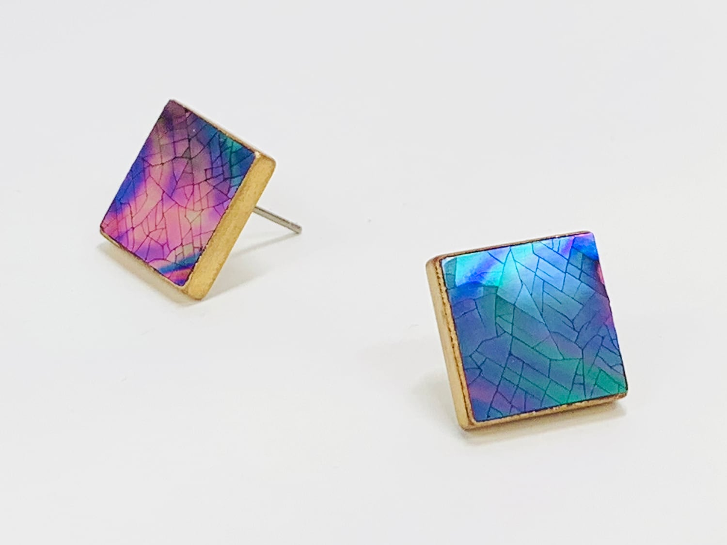螺鈿を漆で貼りつけ、薄貝の割貝*1で仕上げたシンプルで高級感のあるスタッドピアスです。側面の金色は真鍮、銀色は錫です。(1枚め:夜光貝、2枚め:鮑貝、3枚め:黒蝶貝)